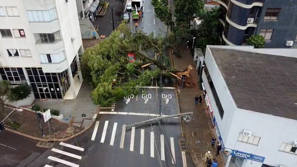 Imagens de drone revelam estragos após queda de árvore em Cascavel