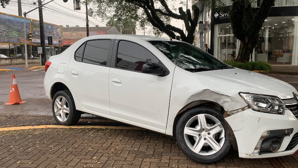 Carro sobe na calçada após batida em cruzamento com semáforo, em Cascavel