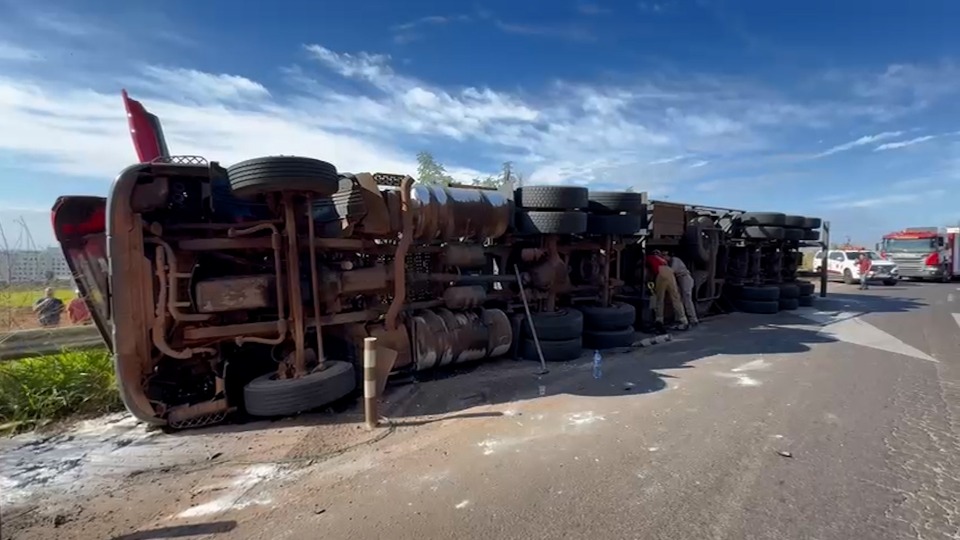 Carreta carregada com farinha tomba entre Paiçandu e Maringá