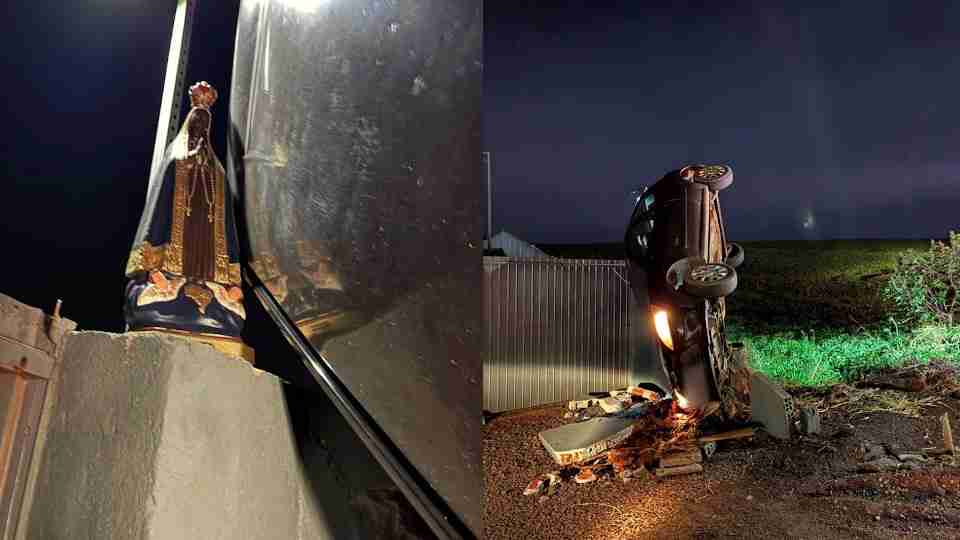 Carro capota e para diante de imagem de Nossa Senhora Aparecida; motorista sai ilesa