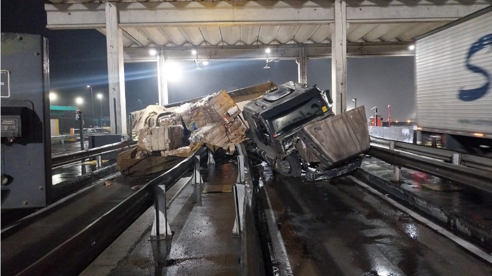 Motorista erra a cancela na praça de pedágio na BR-116 e caminhão tomba