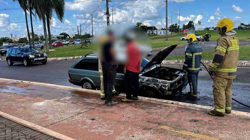 Carro pega fogo no Trevo Guarujá em Cascavel