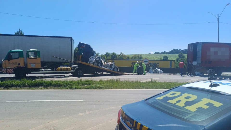 Três morrem e dois ficam gravemente feridos após carro ser prensado entre caminhões na BR-376