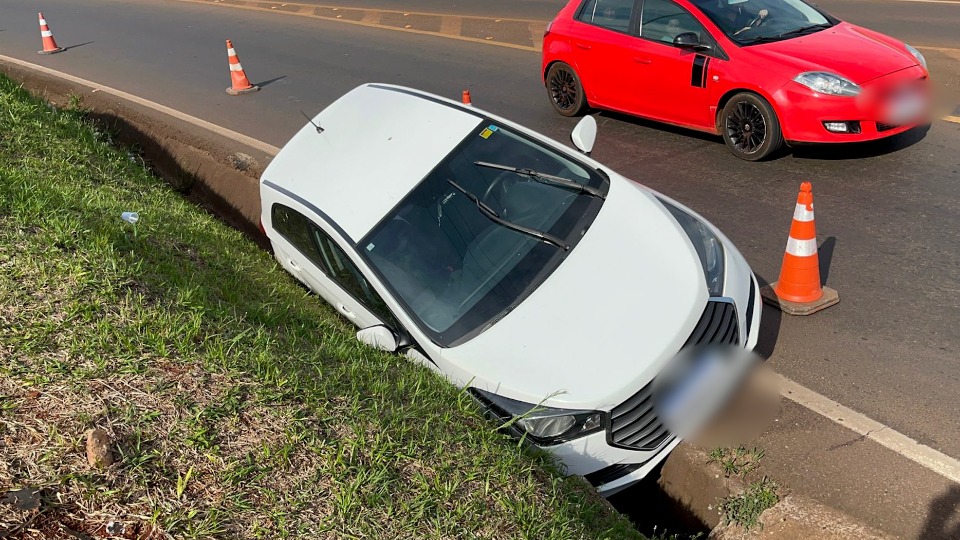 Carro cai em canaleta no Trevo Guarujá, em Cascavel
