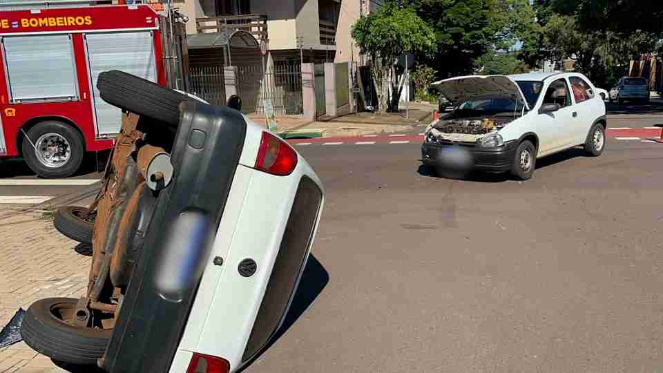 Carro capota após acidente em cruzamento no bairro Maria Luiza