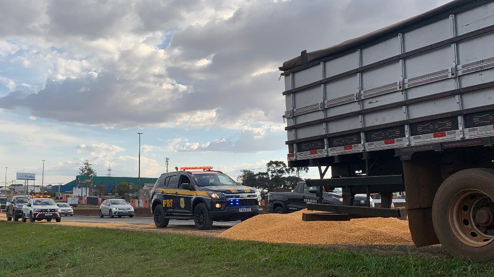 Pneu de caminhão estoura e carga de milho é derramada na pista em Cascavel