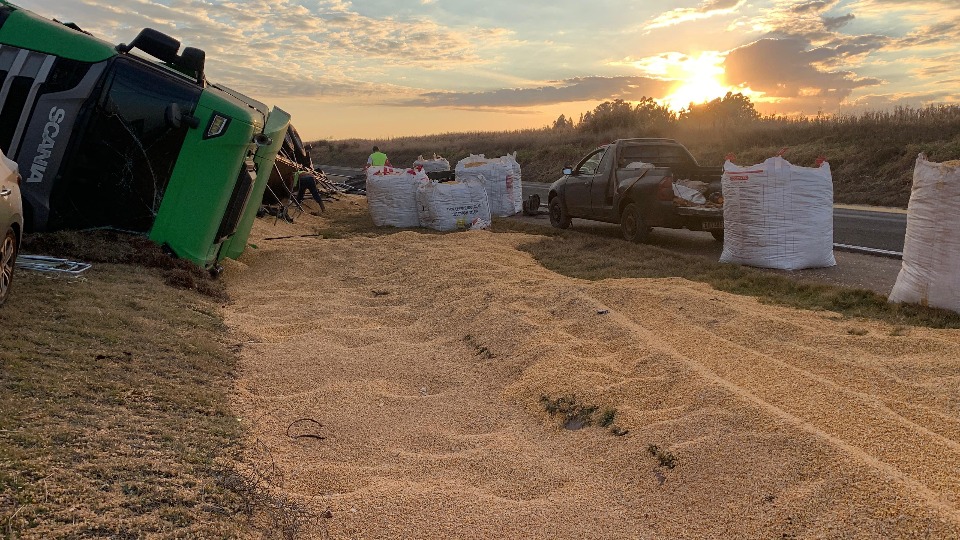 Carreta carregada com milho tomba na BR-163
