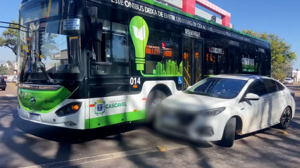 Ônibus do transporte coletivo e carro batem próximo à Praça do Migrante, em Cascavel