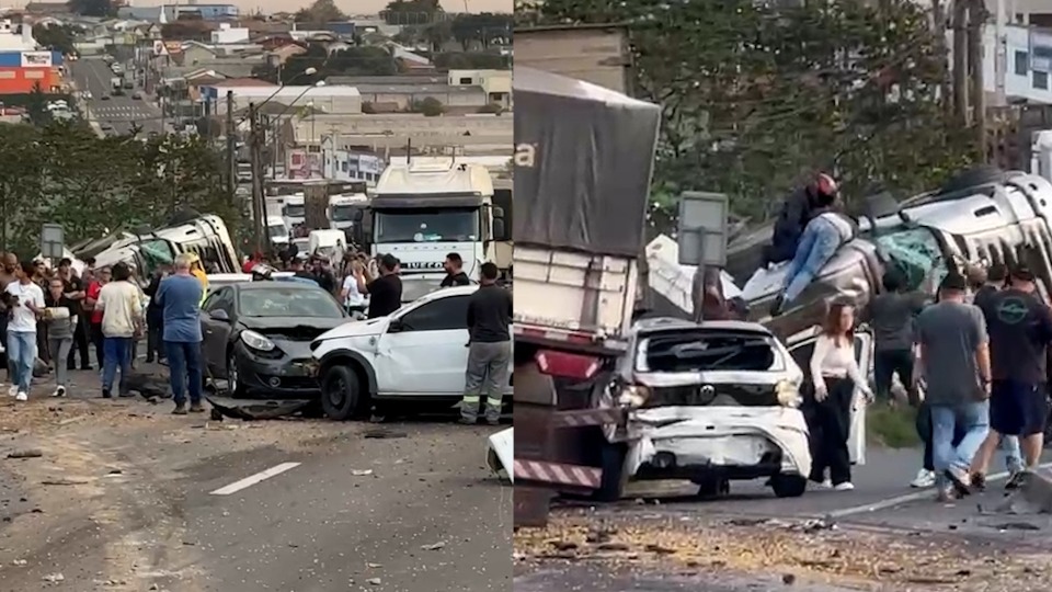 Carreta desgovernada atinge oito veículos e deixa três feridos na BR-376; vídeo